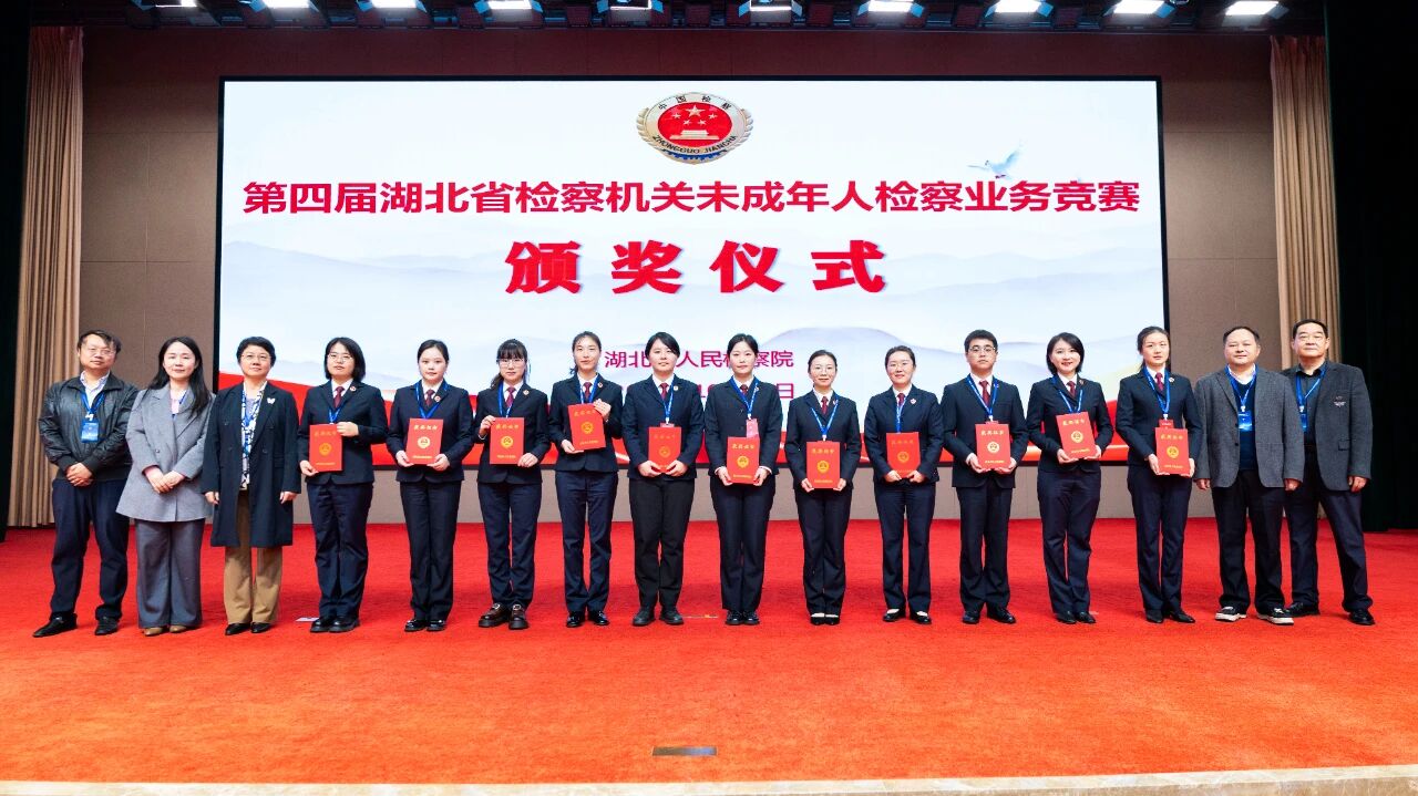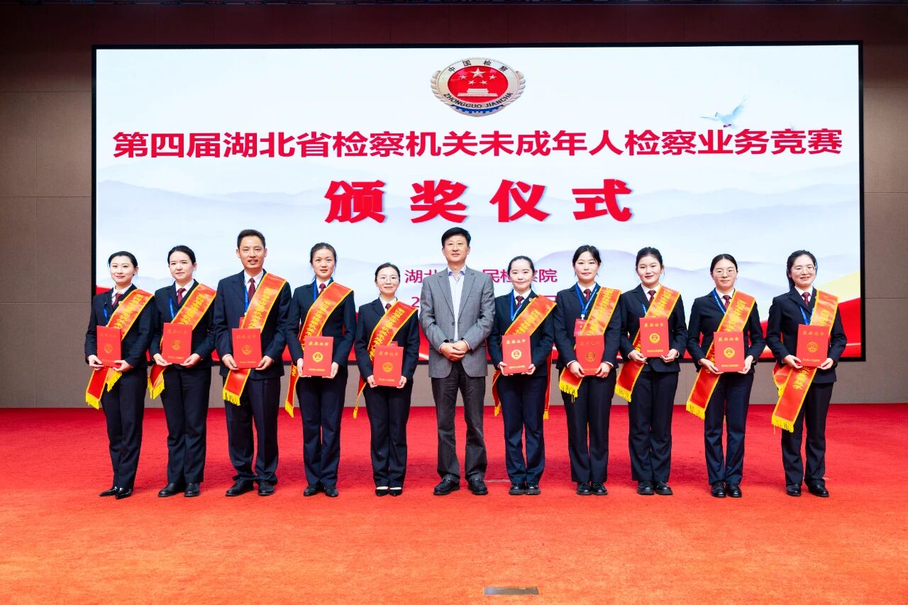圖為湖北省檢察院副檢察長吳婕為10名獲得“全省未成年人檢察業(yè)務標兵”稱號的參賽選手頒獎